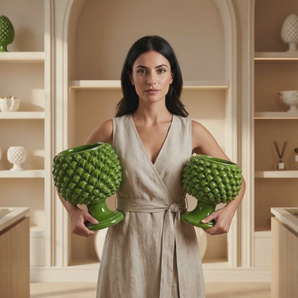 The Half Pine Cone Green Leaf Vase is a unique artisanal creation, entirely handcrafted by the master ceramists of Ceramiche Sofia . This splendid piece features a delicate pine cone decoration, a symbol of prosperity and welcome in Sicilian tradition, and a vibrant leafy green hue reminiscent of Mediterranean landscapes. The glossy finish and impeccable details are a testament to the extraordinary craftsmanship of Caltagirone, making each piece a unique masterpiece.